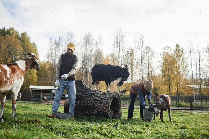 Два фермера кормят коз на лугу с огромным бревенцем на животноводческой ферме