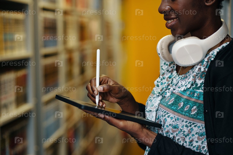 Студент, использующий цифровой планшет в библиотеке