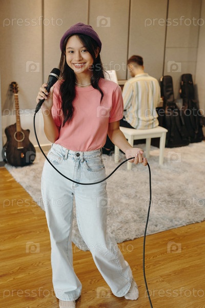 Улыбающаяся женщина держит микрофон в музыкальной студии