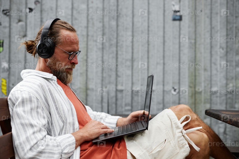 Бородатый мужчина использует компьютер в больших наушниках, работая онлайн