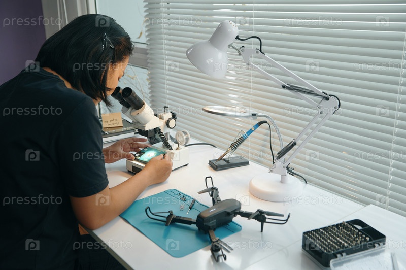 Мастер изучение деталей дрона в микроскопе
