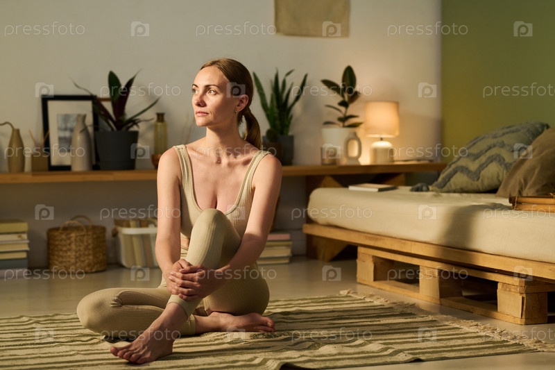 Спокойная женщина в бежевой активной одежде
