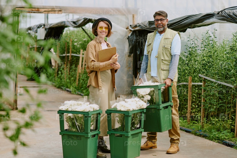 Улыбающиеся фермеры стоят в теплице с собранными цветами