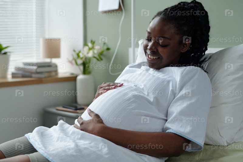 Беременная женщина улыбается, отдыхая в удобной кровати