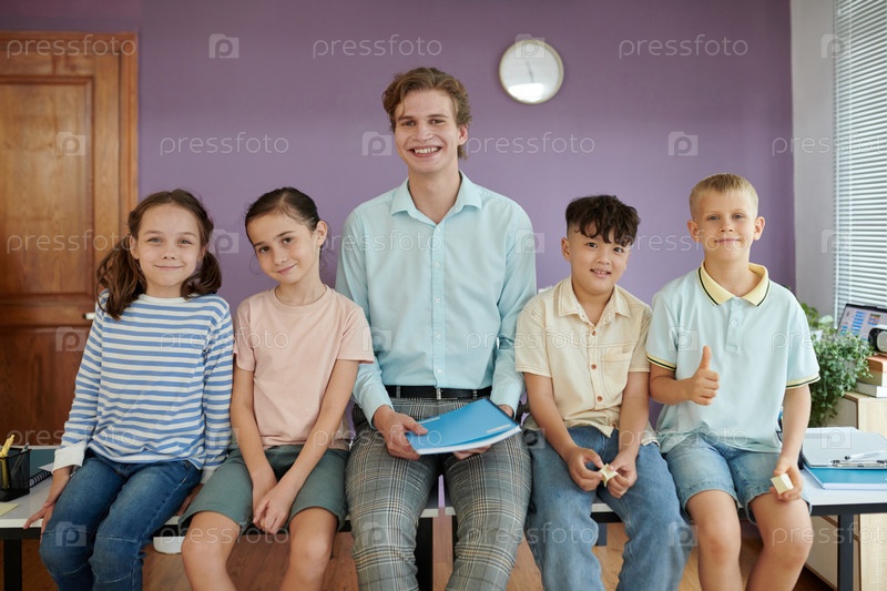 Группа школьников, сидящих со своим учителем и улыбающихся