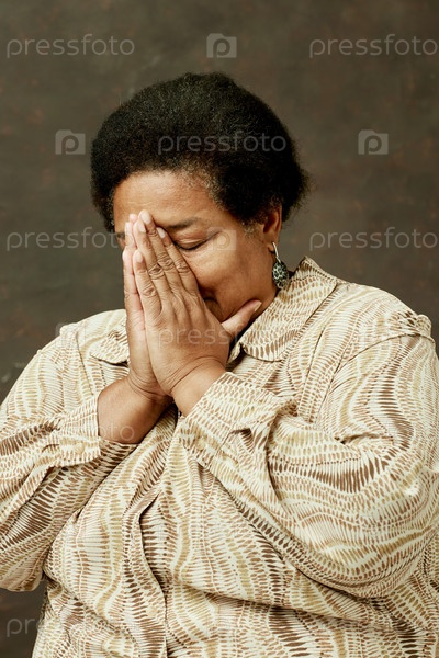 Старшая чернокожая женщина покрывает лицо руками на коричневом в студии