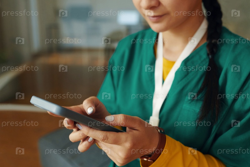 Азиатская женщина, одетая в зеленые скрабы, сидит и использует планшет
