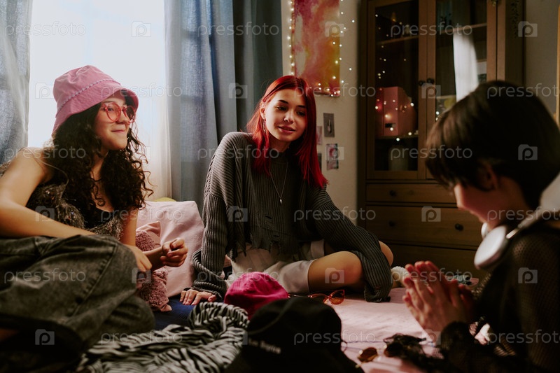 Друзья отдыхают вместе в уютной обстановке спальни