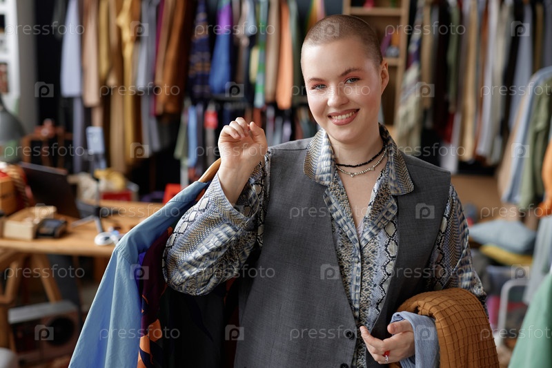Портрет улыбающейся женщины с Buzz Cut в магазине
