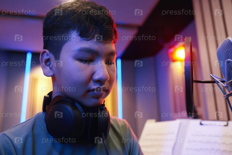 Подросток использует записывающий студийный микрофон для подготовки речи