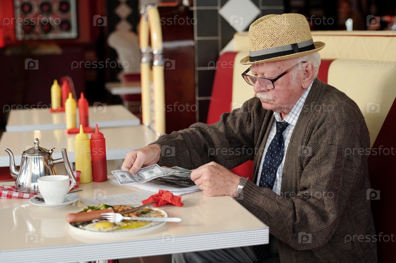 Пожилой мужчина считает деньги в кафе, сидя