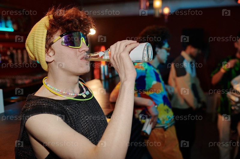 Фанки-мужчина в солнцезащитных очках пьет пиво