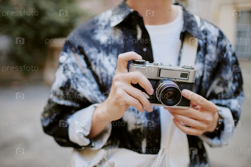 Удерживая винтажную камеру во время открытого приключения