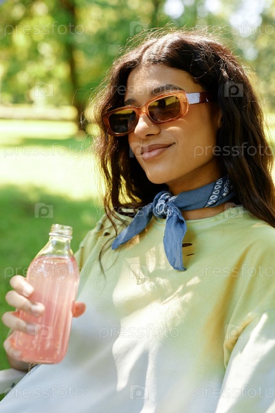 Улыбающаяся девочка-подросток в солнцезащитных очках наслаждается освежающим напитком в парке