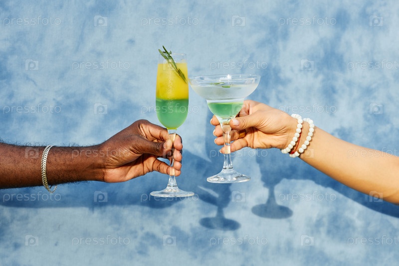 Клинкинговые коктейльные бокалы на синем фоне