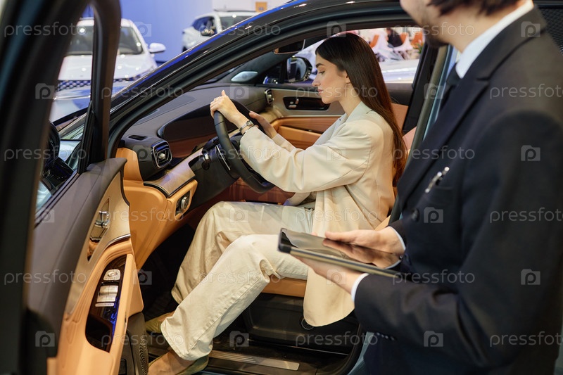 Клиент, выбирающий купить новый автомобиль за рулем в дилерском центре