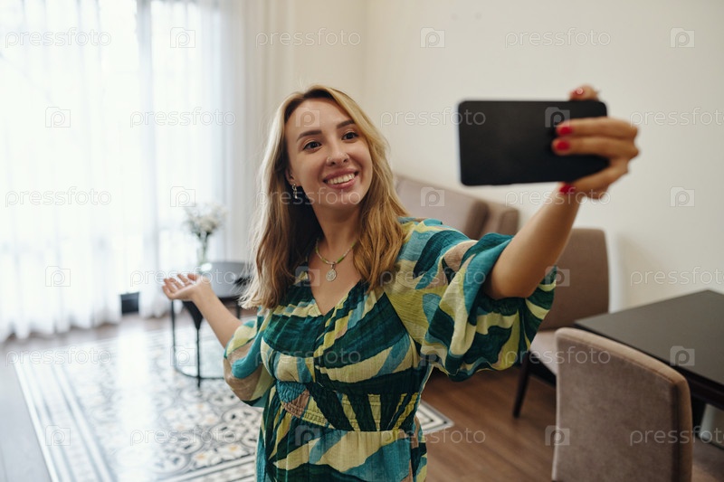 Портрет улыбающейся женщины, делающей селфи в уютной гостиной