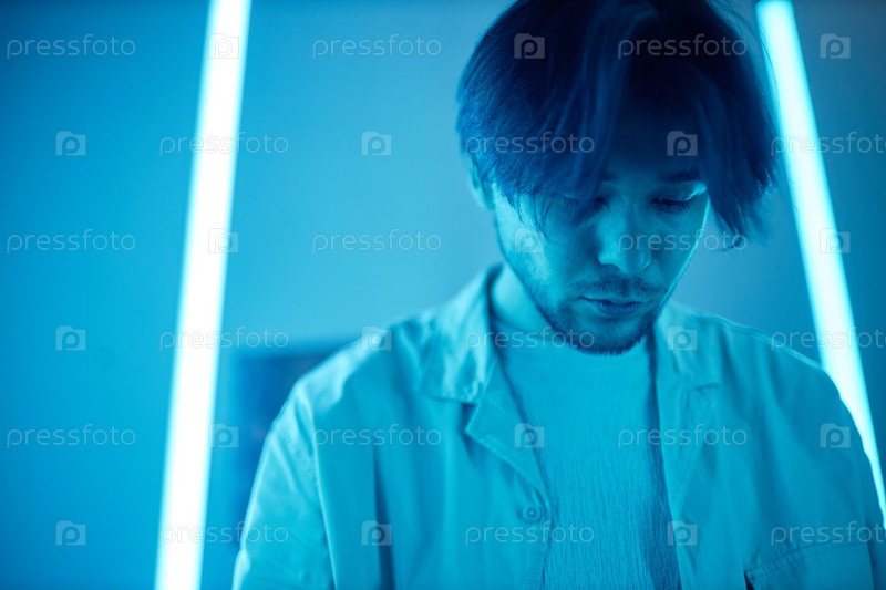 Азиатский мужчина в комнате с синими неоновыми огнями