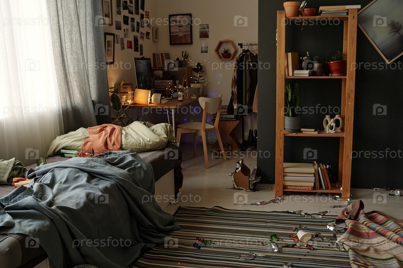 Интерьер беспорядочной спальни после выпивки