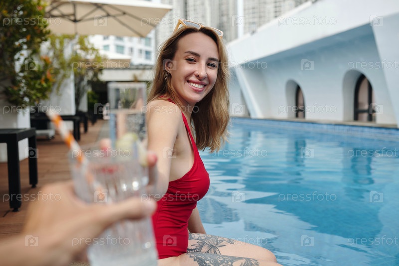Улыбающаяся женщина наслаждается летним бассейном в городской обстановке