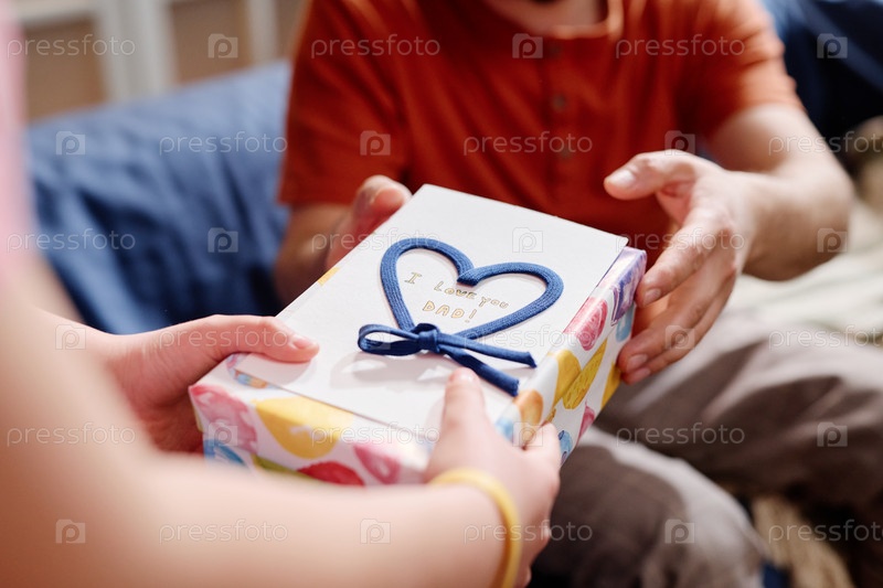 Руки обмениваются красочным подарком, завернутым в голубую ленту