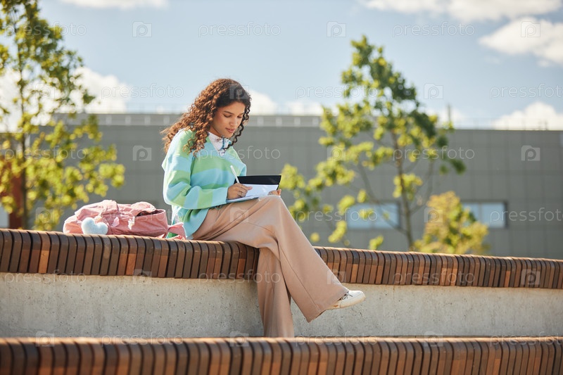 Девушка-подросток на скамейке пишет в блокноте, делает домашнее задание в парке