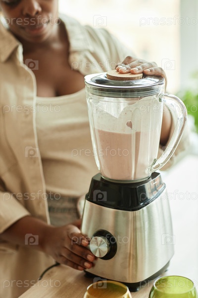 Черная женщина, использующая кухонный блендер для смешивания ингредиентов на бежевом столе