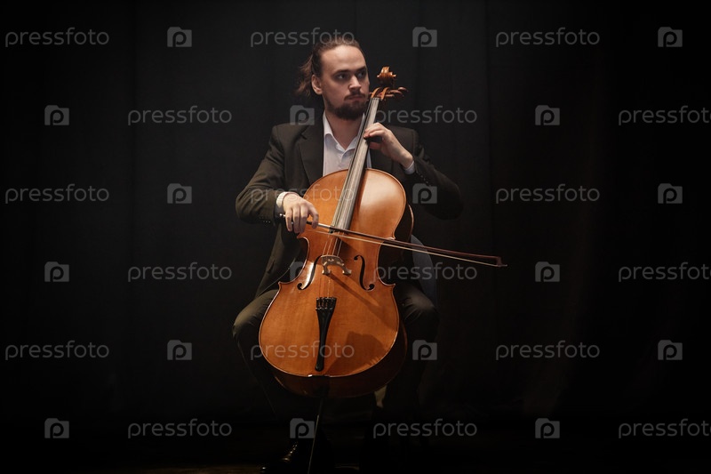 Виртуозный виолончелист исполняет сюжет на темной сцене