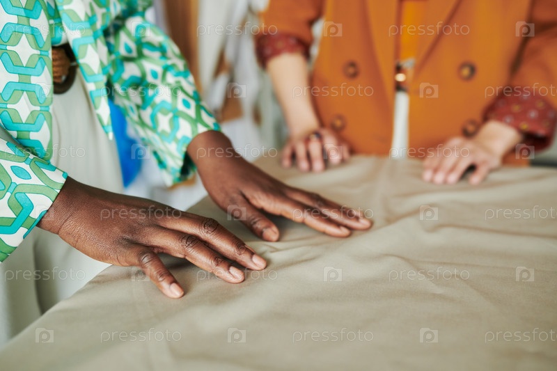 Руки дизайнера касаются серого текстиля