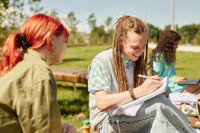Улыбающийся студент пишет в блокноте Изучает на свежем воздухе в солнечный день