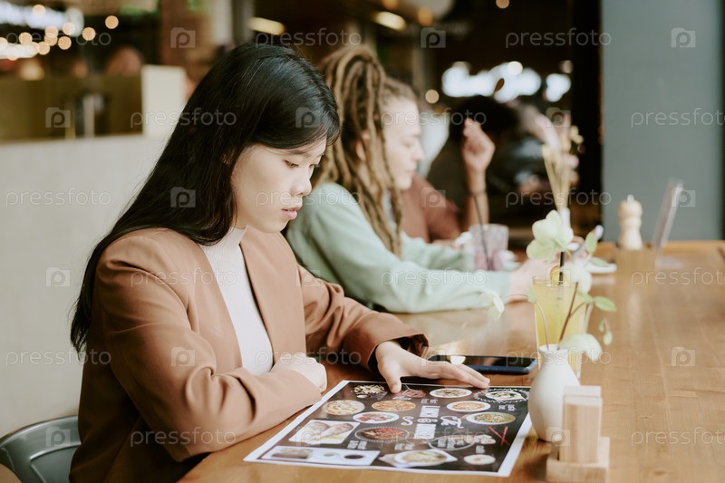 Молодая женщина читает меню в уютном ресторане