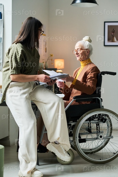 Помощь пожилой женщине в инвалидном кресле с передачей документов