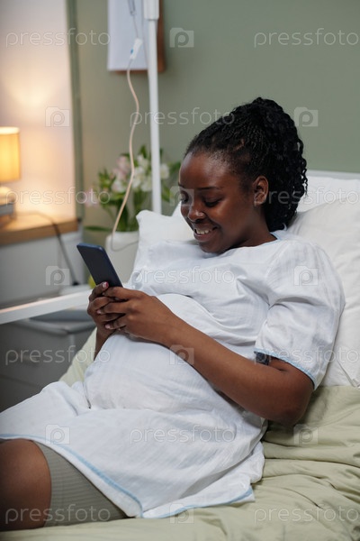 Улыбающаяся беременная женщина использует смартфон в больничной постели