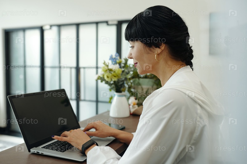Женщина, регистрирующая клиентов онлайн на ноутбуке