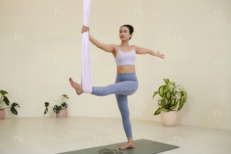 Выполнение воздушной йоги с изящной позой на коврике