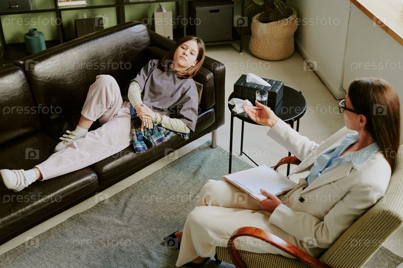 Молодая женщина в терапевтическом сеансе обсуждает с психотерапевтом
