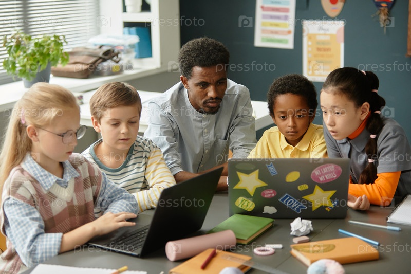 Учитель помогает детям с помощью ноутбуков, сидящих за столом в классе