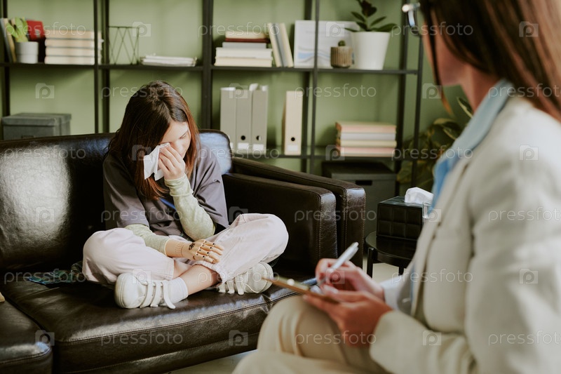 Молодая женщина плачет во время сеанса консультирования, сидя на диване