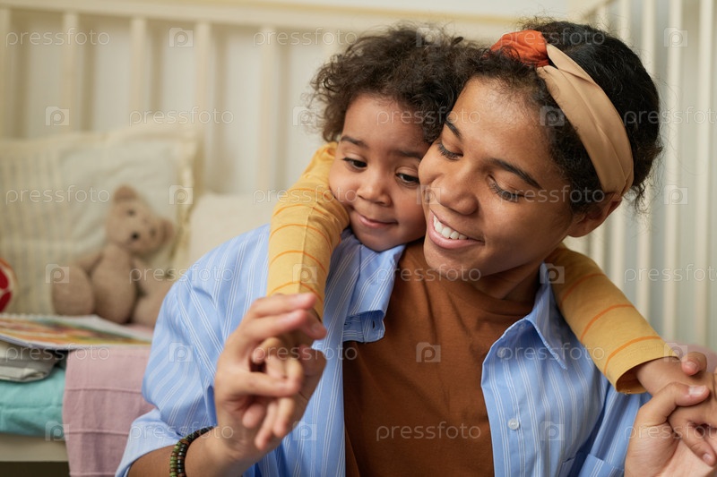 Улыбающаяся мать обнимает ребенка в уютной спальне