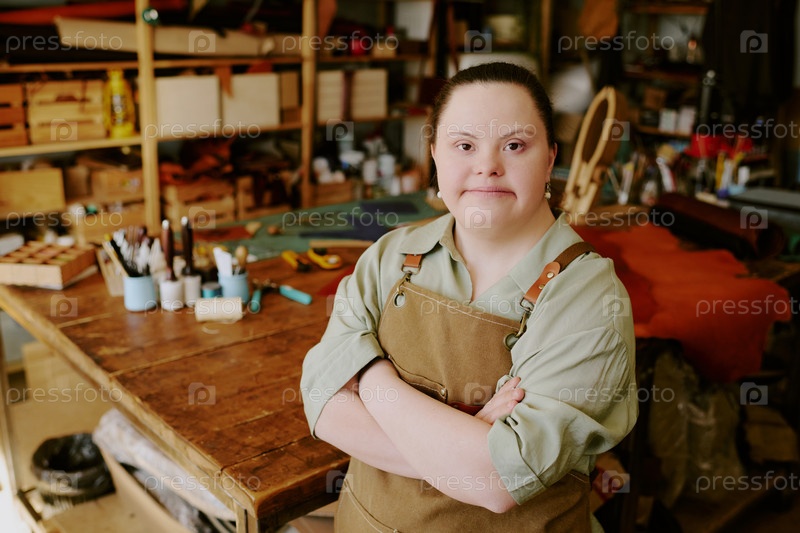 Портрет женщины, работающей в ателье с синдромом Дауна