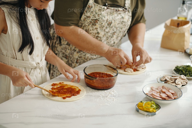 Семья готовит домашнюю пиццу на кухне