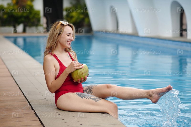 Расслабляясь у бассейна, держа свежий кокосовый напиток