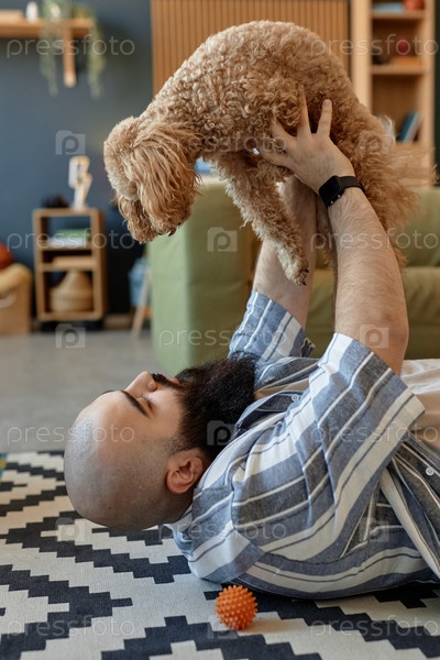 Бородатый мужчина поднимает куриную собаку в квартире