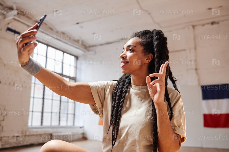 Афроамериканская женщина делает селфи на баскетбольной площадке
