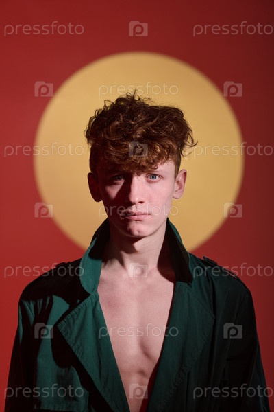 Портрет молодого человека, стоящего на ярком фоне