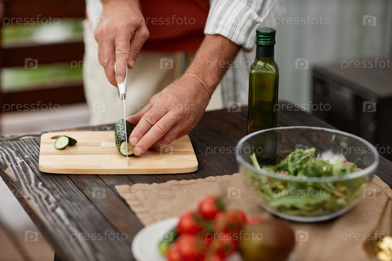 Человек делает салат, режущий овощи на террасе