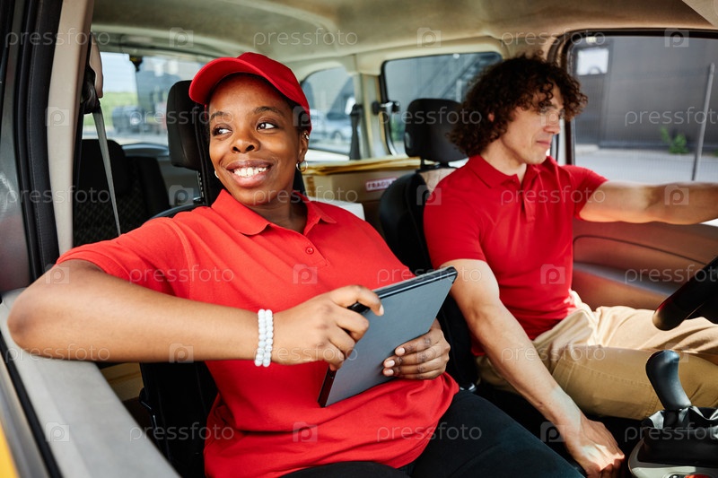 Улыбающийся работник доставки использует планшет в транспортном средстве