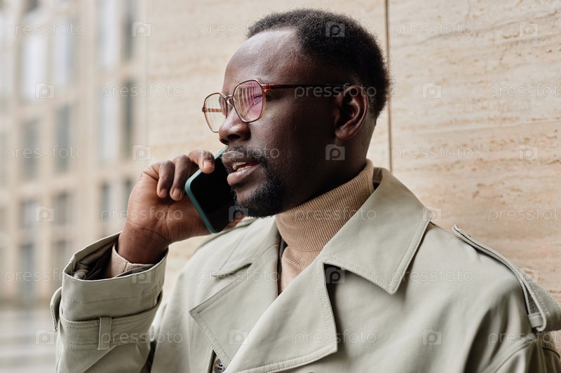 Улыбающийся афроамериканец держит смартфон и говорит