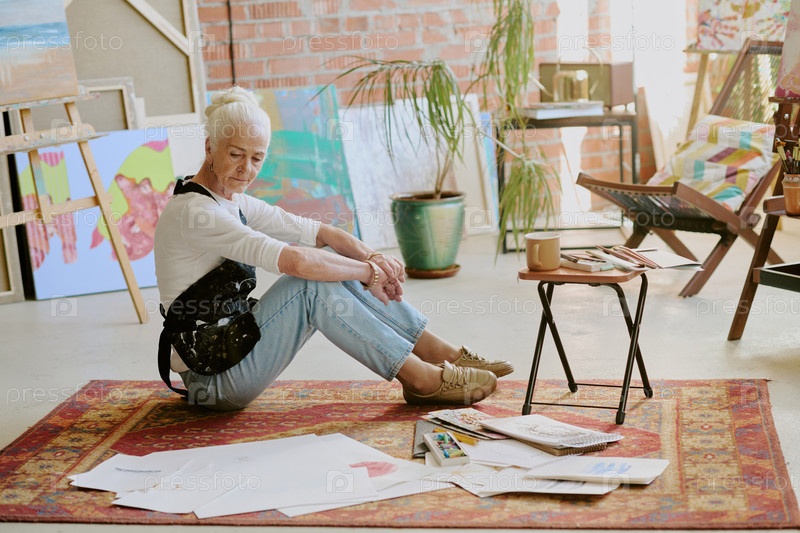 Пенсивный художник сидит на полу в своей студии