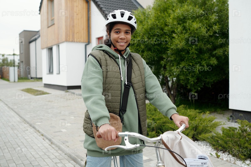 Девушка в спортивном шлеме доставляет почту